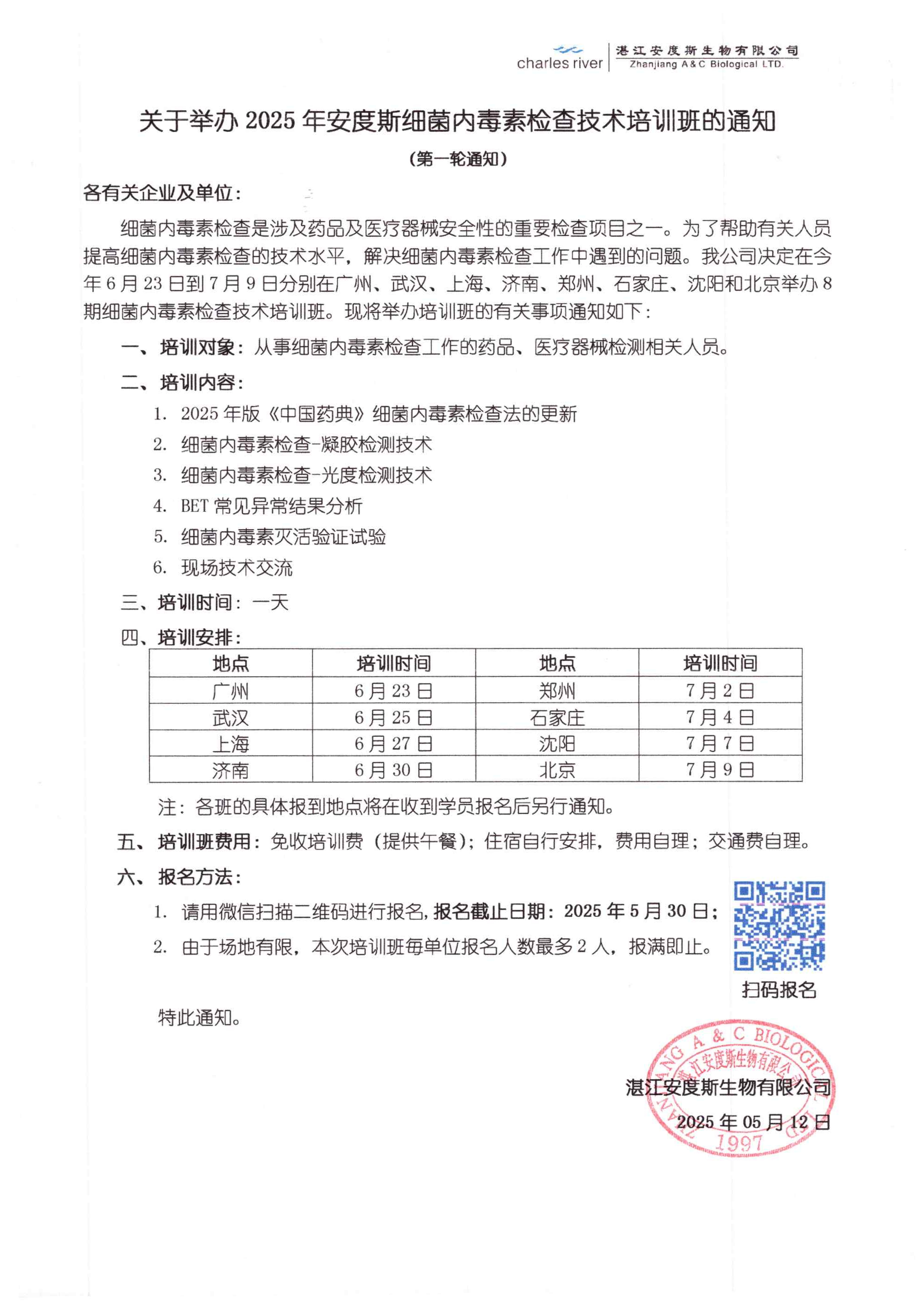 为帮助大家提高细菌内毒素检查技术水平,解决工作中遇到的问题,我公司决定在今年6月23日到7月9日分别在广州、武汉、上海、济南、郑州、石家庄、沈阳和北京举办8期细菌内毒素检查培训班